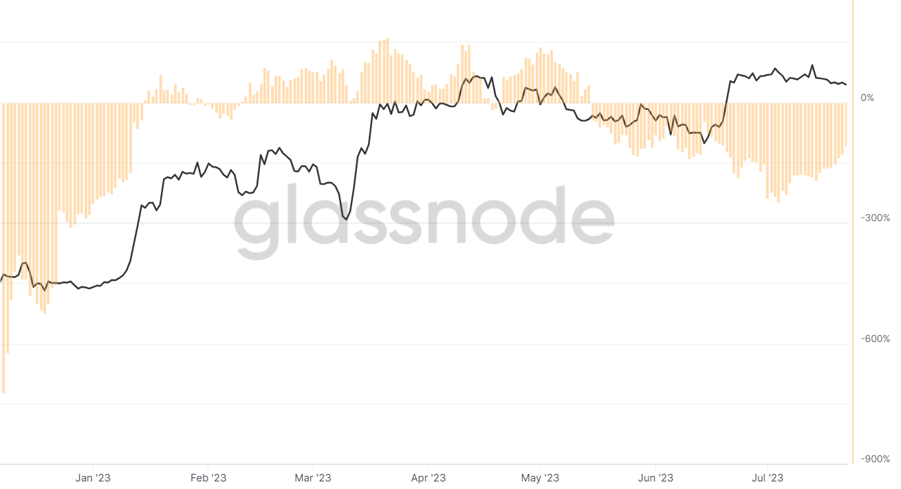 كما ظل المعدل الشهري لامتصاص البتكوين سلبيًا منذ مايو. كما يبلغ معدل الامتصاص السنوي حاليًا حوالي -100%. ويعني هذا أن المستثمرين قد جمعوا ضعف كمية البتكوين خلال العام الماضي التي أنشأها معدني العملة.
