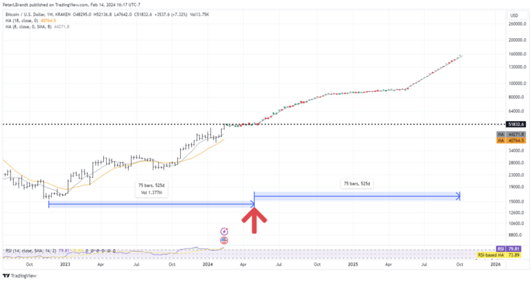 "إذا كانت وتيرة الاتجاه الصعودي بعد أبريل 2024 بوتيرة مماثلة للاتجاه الصعودي منذ أدنى مستوى في نوفمبر 2022، فقد يصل الارتفاع في أكتوبر 2025 إلى حوالي 150 ألف دولار. وقال براندت: "ومع ذلك، فإن التقدم بعد النصف خلال الدورات الصعودية السابقة كان أكثر حدة بكثير من التقدم قبل النصف".