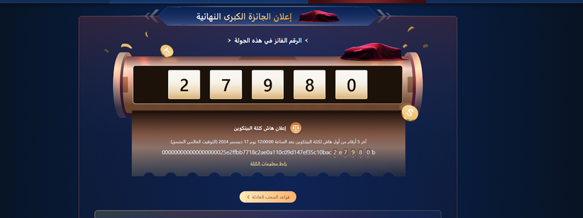 كانت MEXC رائدة في استخدام قيم تجزئة كتلة بيتكوين لتحديد الفائز بالجائزة الكبرى، مما يضمن شفافية وعدالة لا مثيل لها في هذه العملية. تم منح الجائزة الكبرى المرغوبة، وهي سيارة خارقة فائقة الجودة بقيمة 500,000 USDT، للمشارك المحظوظ الذي كان رقم تذكرته (05980) هو الأقرب إلى الأرقام الخمسة الأخيرة (27980) من هاش أول كتلة بيتكوين تم إنشاؤها بعد الساعة 20:00:00 UTC+8 في 17 ديسمبر 2024. وشملت الجوائز المثيرة الأخرى ساعات رولكس المرغوبة ومنتجات لويس فيتون الفاخرة وأجهزة كمبيوتر أبل ماك بوك.