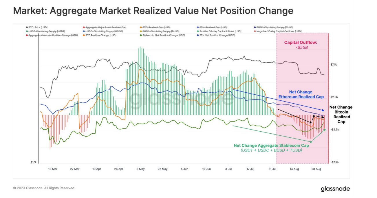 ووفقًا لتقرير منصة Bitfinex، سحب المستثمرون ما يقرب من 55 مليار دولار من السوق في أغسطس عبر بيتكوين وإيثيريوم وخمس عملات مستقرة. كما استخدمت بورصة العملات المشفرة مقياس القيمة الإجمالية المحققة لاستخلاص النتيجة.