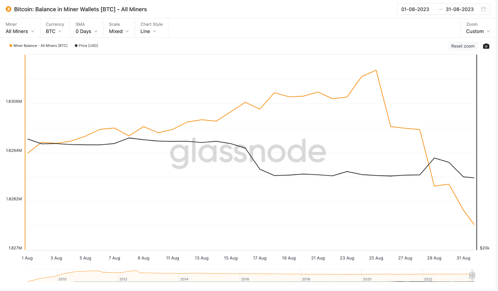 إضافة إلى ما سبق، تظهر بيانات منصة غلاسنود أن رصيد بيتكوين في محفظة التعدين قد انخفض بشكل حاد منذ 25 أغسطس.
