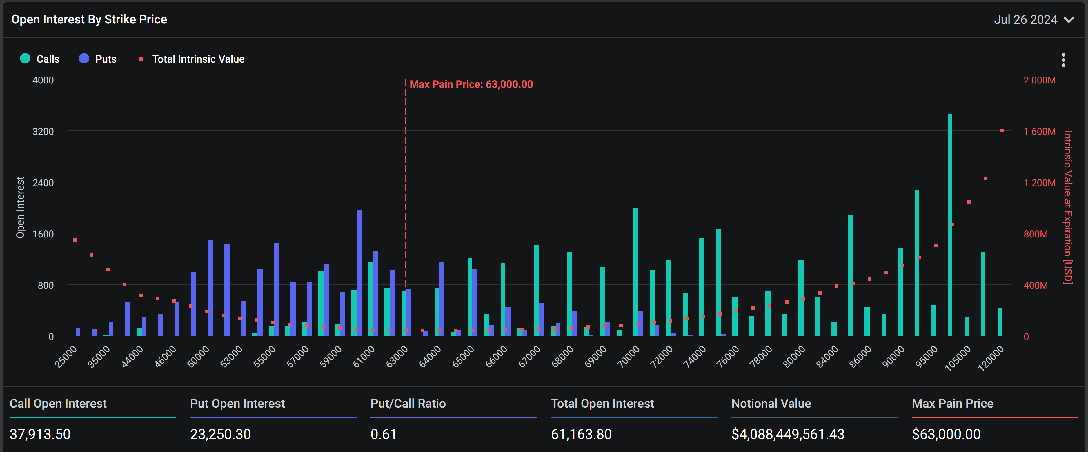 تشمل انتهاءات اليوم 61,320 عقد بيتكوين بقيمة تقريبية 4,07 مليار دولار، وفقاً لبيانات Deribit. هذه زيادة ملحوظة عن رقم الأسبوع الماضي الذي كان 20,679 عقد. نسبة البيع إلى الشراء الحالية هي 0,61، مع نقطة ألم قصوى تبلغ 63,000 دولار.