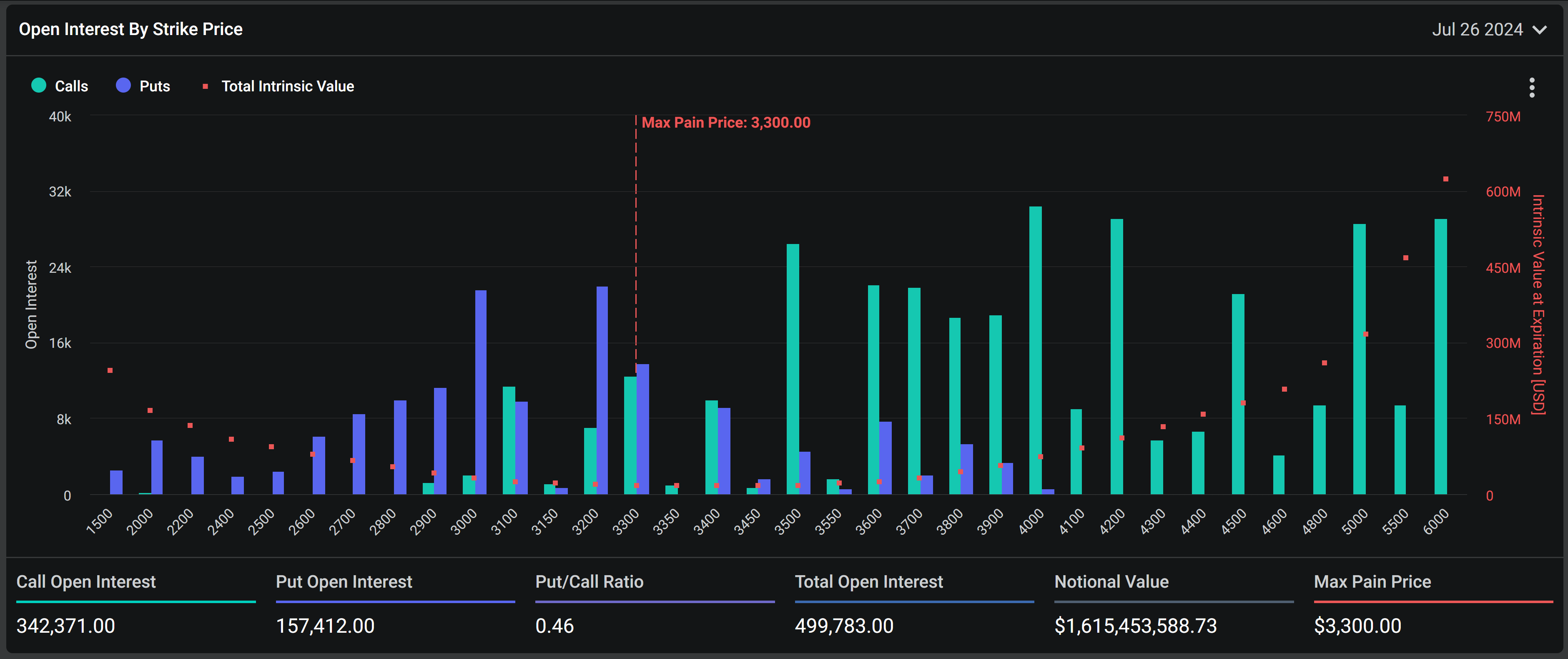 بالمثل، تشهد خيارات الإيثريوم انتهاءات كبيرة أيضاً، مع 499,803 عقود بقيمة تزيد عن 1,59 مليار دولار من المقرر أن تنتهي. نسبة البيع إلى الشراء للإيثيريوم هي 0,46، مع نقطة ألم قصوى تبلغ 3,300 دولار.