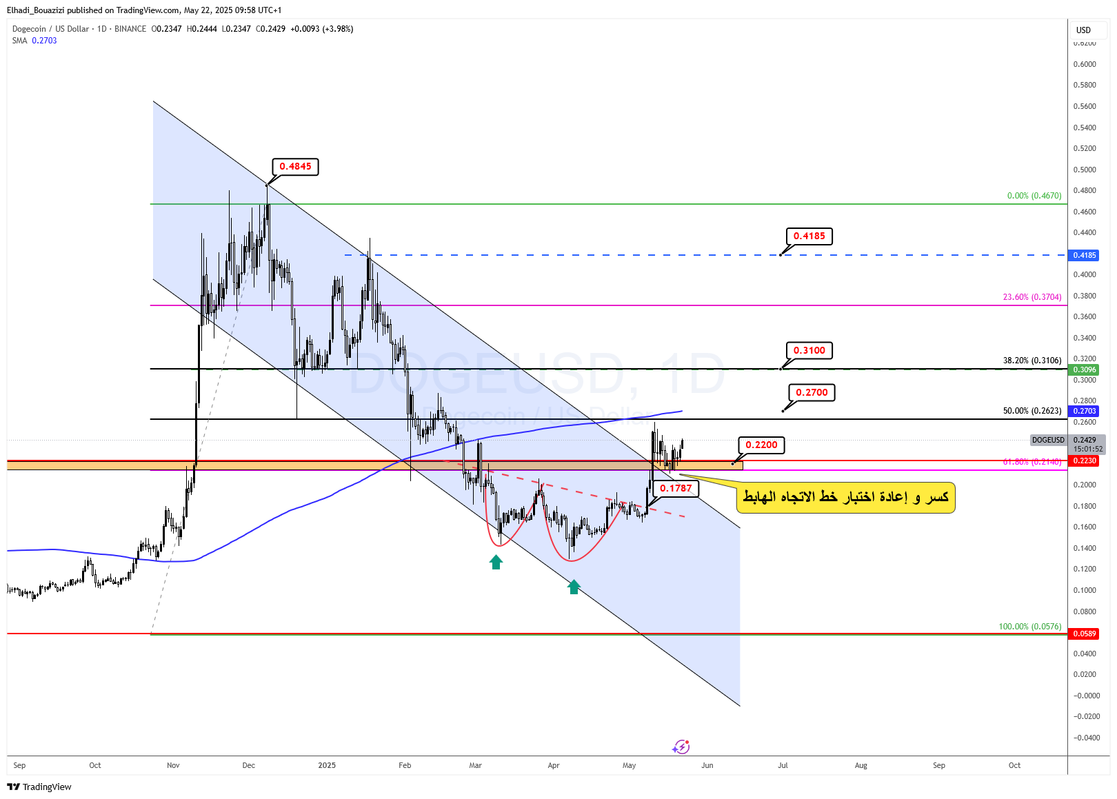 يمثل هذا الاختراق تأكيدًا فنّيًا على نهاية الحركة التصحيحية الهابطة، مع توقّع امتداد الحركة الصاعدة نحو هدف تقني أولي بالقرب من 0.2700 دولار، وهو مستوى يتقاطع مع متوسط 200 يوم البسيط (SMA) وخط فايبوناتشي 50% للموجة الهابطة الكبرى.