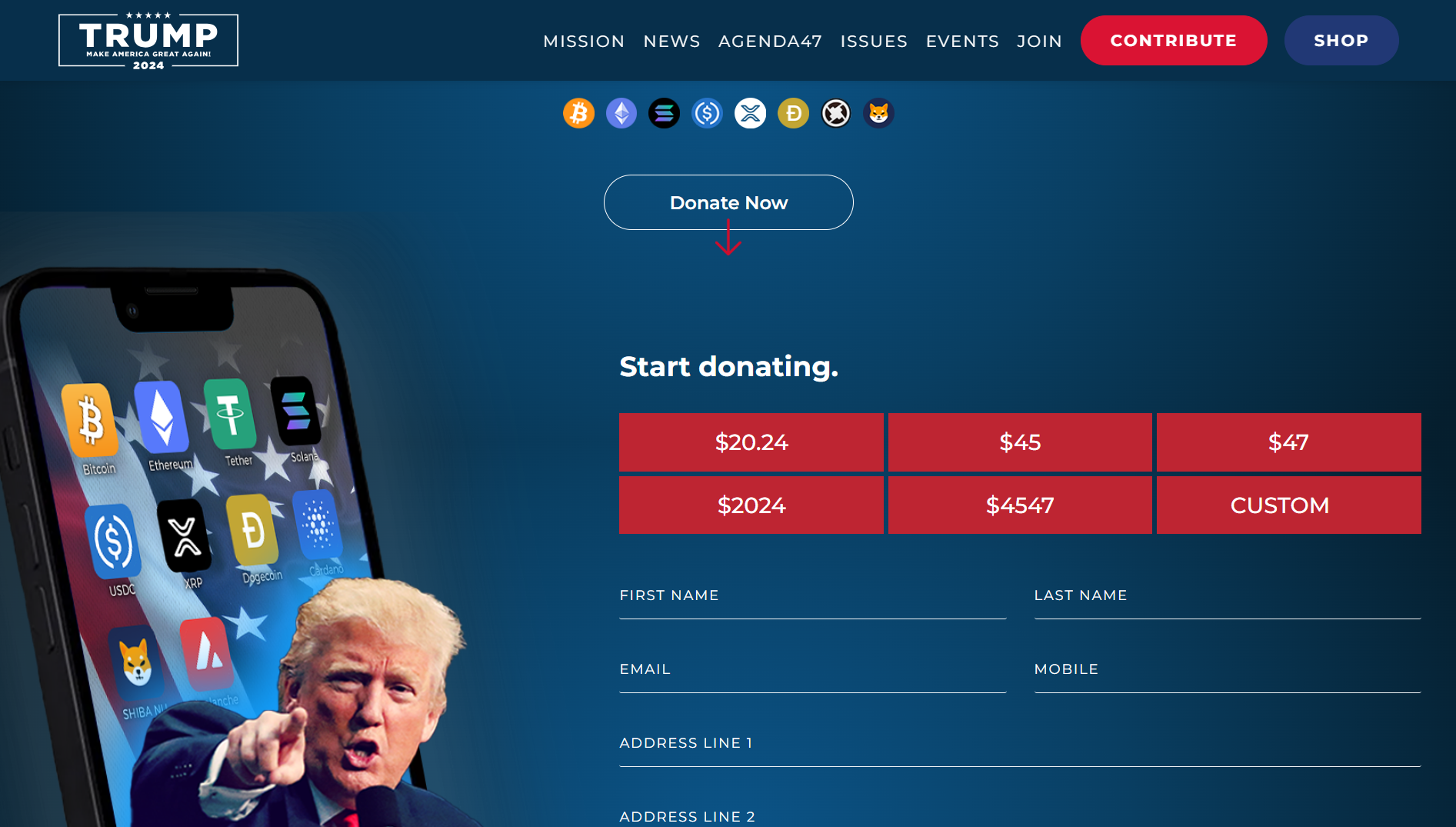 تقبل الحملة العديد من العملات المشفرة ، بما في ذلك Bitcoin (BTC) و Ethereum (ETH) و Solana (SOL) و USDC و XRP و Dogecoin (DOGE) و 0x (ZRX) و Shiba Inu (SHIBA). يمكن للداعمين التبرع بمبالغ مخصصة أو الاختيار من بين الخيارات المحددة مسبقا مثل 20.24 دولارا و 2,024 دولارا و 45 دولارا و 47 دولارا و 4547 دولارا. يمثل الرقمان 45 و 47 رسالة الحملة الرئاسية بأنه الرئيس 45 للولايات المتحدة ويهدف إلى أن يكون الرئيس 47.