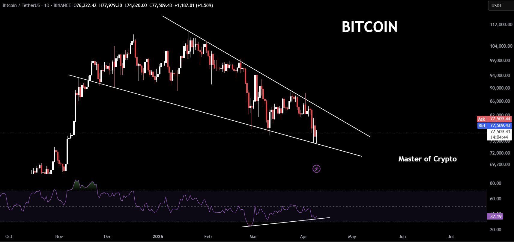 في المقابل، تبنى المحلل Master of Crypto نظرة أكثر تفاؤلًا، مشيرًا إلى تشكل و النموذ الفني الانعكاسي الوتد الهابط، و أبضا انفراج (الدايفرجنس) الصاعد في مؤشر القوة النسبة RSI على الرسم البياني اليومي للبيتكوين.