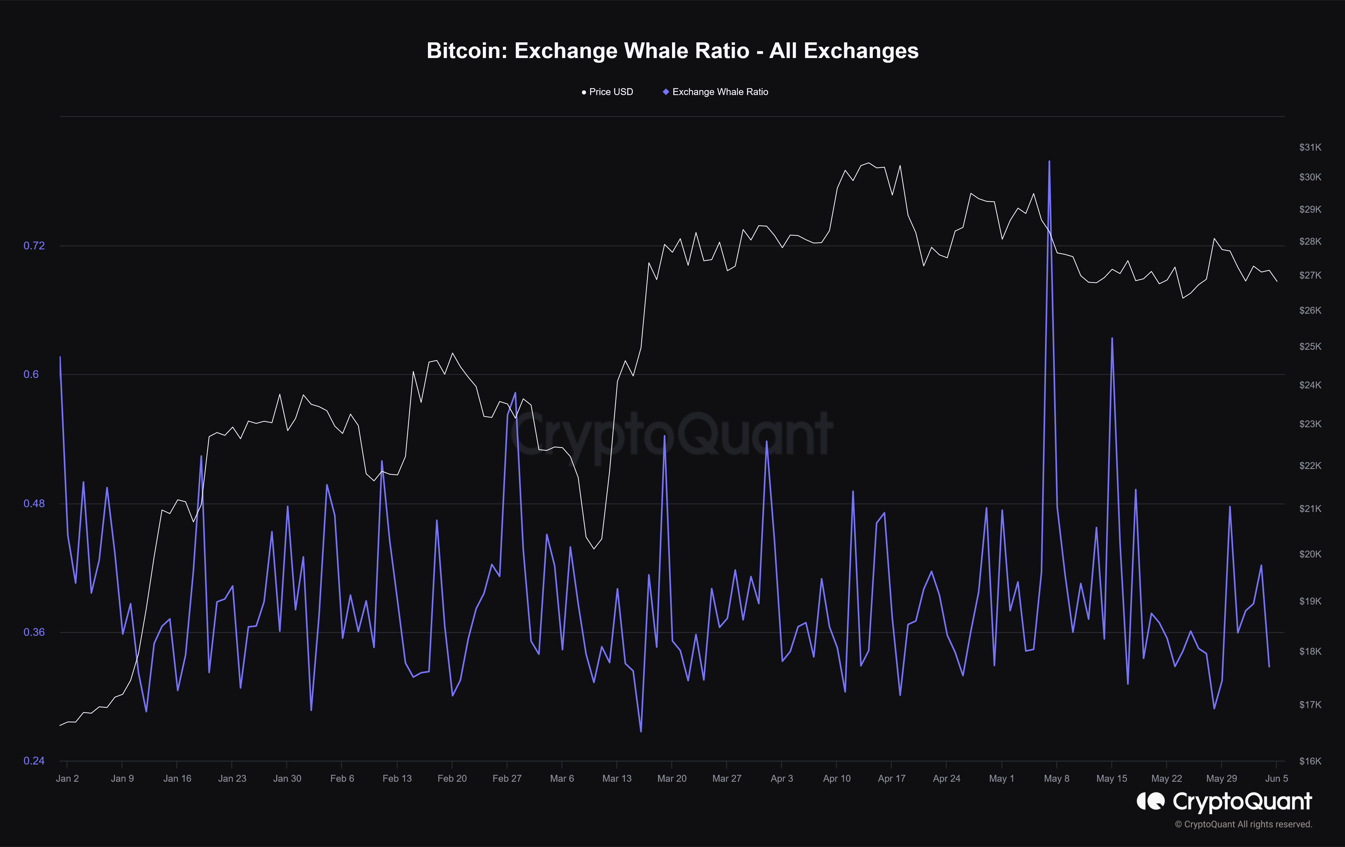 مؤشر نسبة تداولات الحيتان في منصات تداول العملات الرقمية Exchange Whale Ratio انخفض إلى مستوى 0.28 و هي النسبة الأدنى منذ شهر مارس الماضي حسب بيانات منصة cryptoquant. و هذا يعني أن الحيتان قد سحبت جزءًا كبيرًا من حيازاتها من محافظها في منصات التداول وبالتالي انخفاض نسبة تداولاتهم في البورصة.