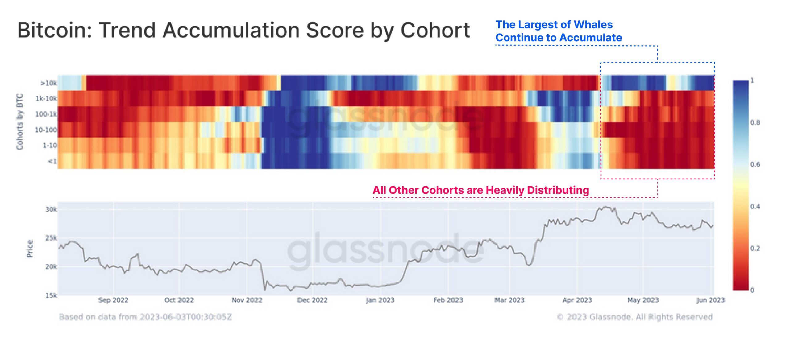 تشير البيانات المقدمة من شركة تحليلات سلسلة الكتل Glassnode إلى أن كبار المالكين لعملة بيتكوين أو الحيتان اشتروا وزادوا من حجم حيازاتهم من العملة الأكبر في السوق طيلة شهر مايو الماضي. كما أظهرت بيانات أخرى أن هؤلاء الحيتان قد استمروا في سحب عملات البتكوين من محافظهم في بورصات تداول العملات الرقمية. في حين أن المجموعات والأقسام الأخرى من المالكين باعوا انقصوا من حجم ممتلكاتهم مع تباين واختلاف كبير في حدة و درجة التراجع.
