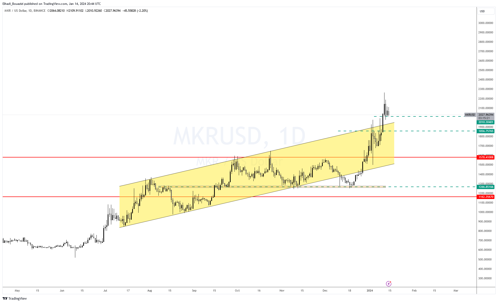 كان سعر عملة مايكر MKR يتحرك في قناة سعرية صاعدة. قبل أن يتمكن من كسر حدّها في العلوي. في موجة الارتفاع الحاد الأسبوع الماضي. يوم 10 يناير الماضي، يوم الموافقة على صناديق ETF بيتكوين.