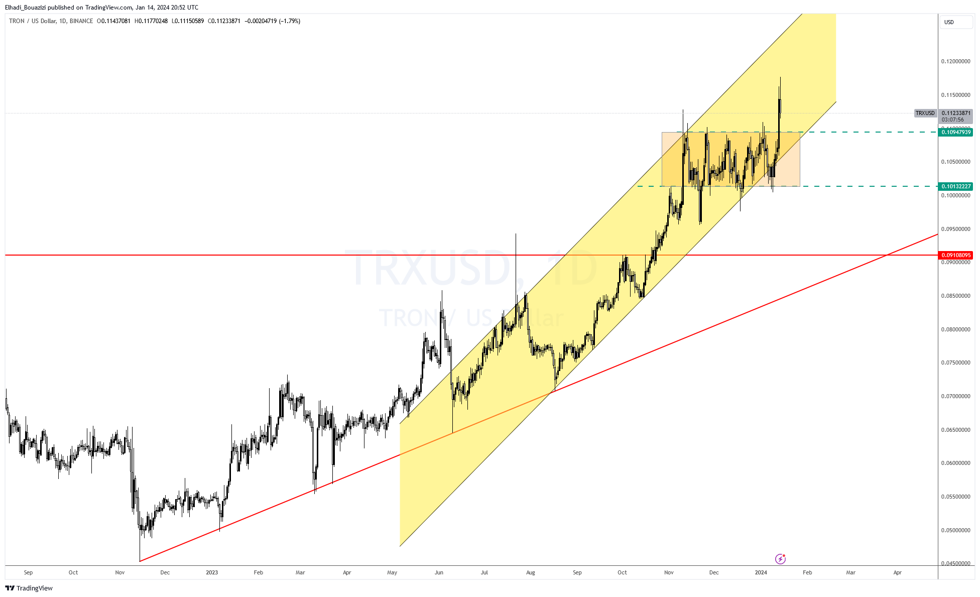 حيث شكّل السعر TRX منذ ذلك الوقت قناة سعرية صاعدة (فوق خط الاتجاه الصاعد) على الرسم البياني اليومي.