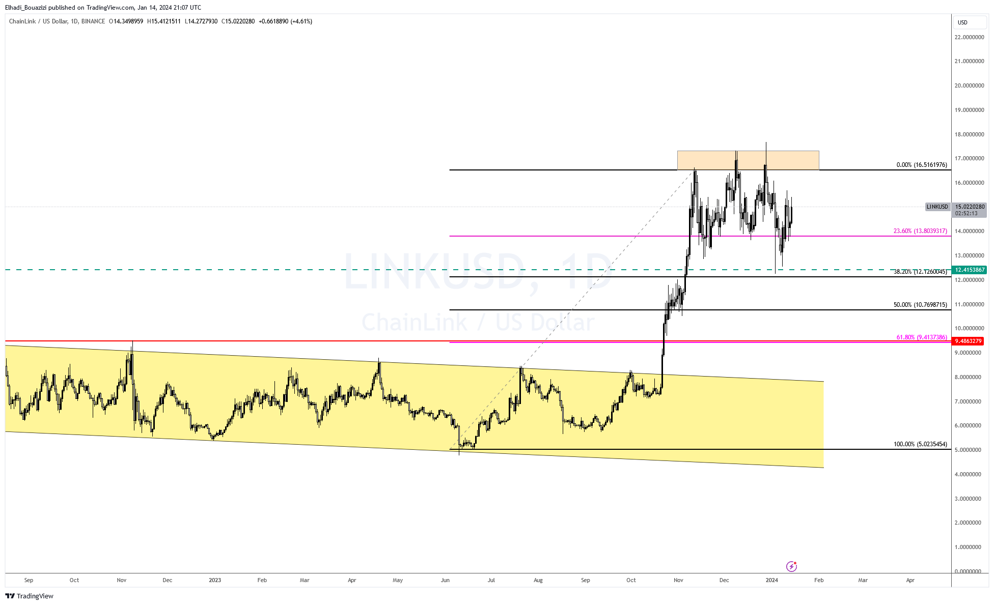 وفي الأسبوع الماضي هبط سعر عملة LINK أكثر نحو مستوى 38.2% واقترب من سعر 12.40 دولار.