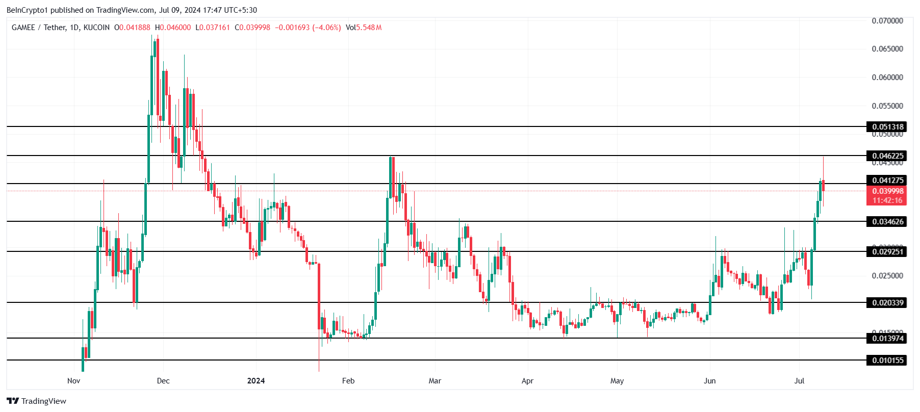سعر جايمي (GAMEE) سجل ارتفاعًا قريبًا من 80% في ثلاثة أيام فقط ليصل إلى أعلى مستوى في خمسة أشهر. أدى هذا الارتفاع إلى تشكيل قمة سوق محتملة للعملة البديلة. غالبًا ما تجذب الزيادات الحادة في الأسعار الانتباه، لكنها قد تشير أيضًا إلى نقطة يبدأ فيها المستثمرون في التفكير في جني الأرباح.