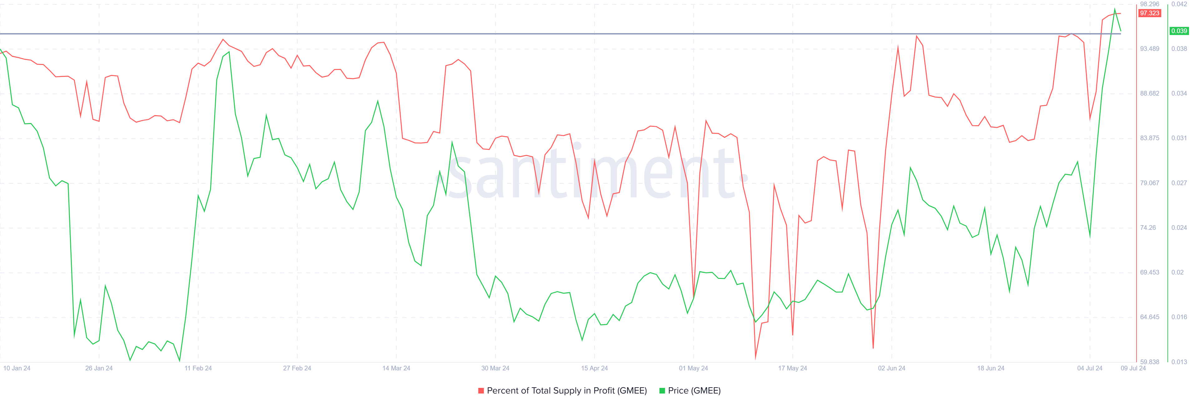 حاليًا، يوجد نسبة مذهلة تبلغ 97% من إجمالي المعروض من GAMEE في وضع ربحي. تسلط هذه الإحصائية الضوء على سيناريو واسع الانتشار حيث شهد غالبية المستثمرين زيادة في قيمة استثماراتهم بسبب الارتفاع الأخير في الأسعار.