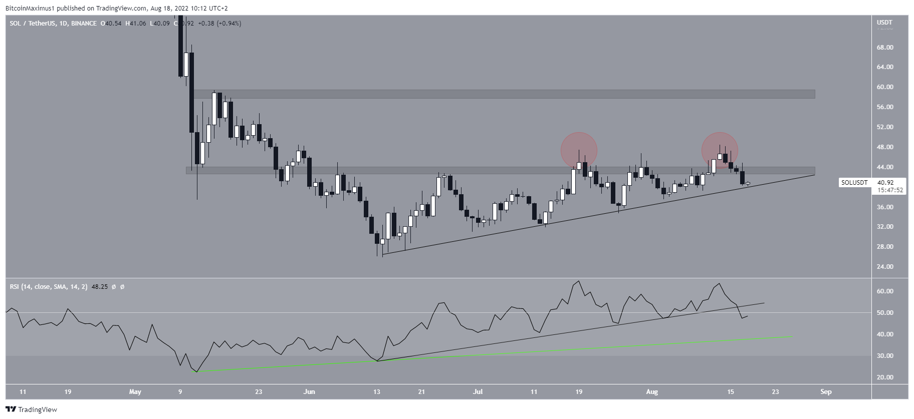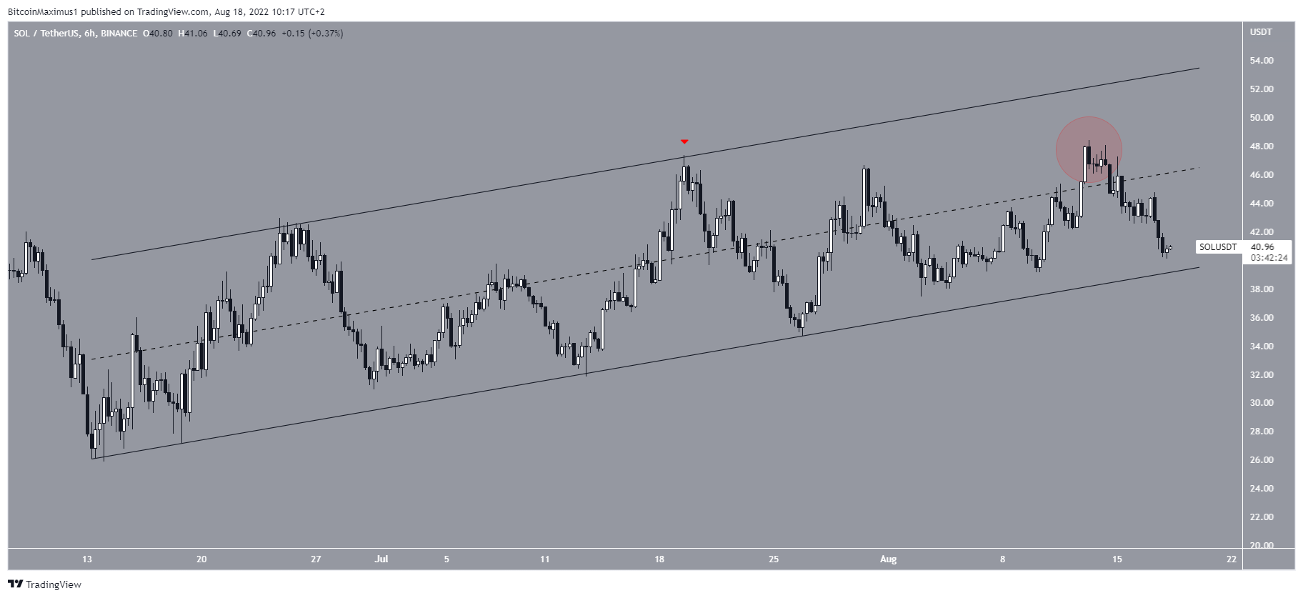 ويعبر الرسم البياني عن 6 ساعات أكثر هبوطاً ويظهر أن رمز سولانا كان من الممكن تداوله داخل قناة موازية صاعدة منذ أدنى مستوياته في يونيو حيث وصوله إلى خط المقاومة في المرة الأخيرة في التاسع عشر من يوليو (علامة حمراء).