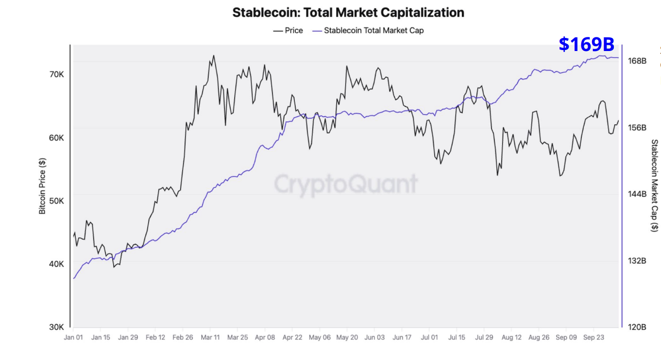 "سيولة سوق العملات المشفرة، المقاسة بقيمة العملات المستقرة، وصلت إلى مستوى قياسي جديد في أواخر سبتمبر. إجمالي القيمة السوقية للعملات المستقرة الرئيسية المدعومة بالدولار الأمريكي بلغ الآن 169 مليار دولار، بزيادة 31% أو 40 مليار دولار منذ بداية العام. زيادة القيمة السوقية للعملات المستقرة ترتبط عادة بارتفاع أسعار بيتكوين والعملات المشفرة الأخرى من خلال تعزيز سيولة السوق"، حسبما زعم تقرير CryptoQuant.