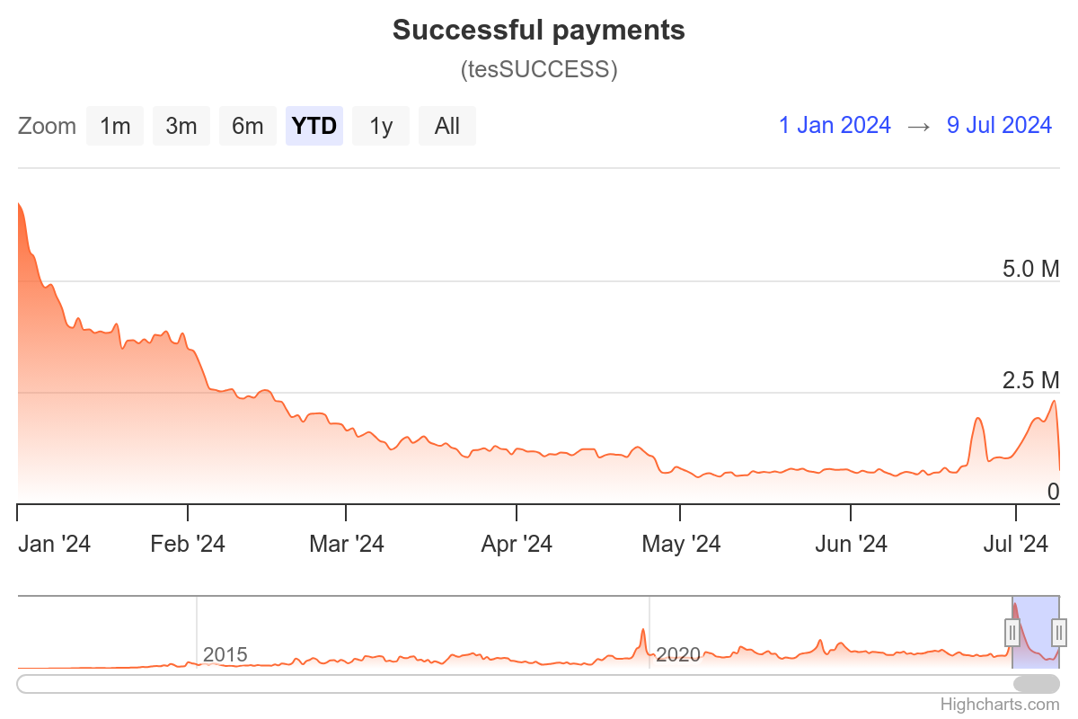 شهد الشهر زيادة ملحوظة في الطلب على البلوكتشين العام الموزع. منذ 1 يوليو، ارتفع عدد المعاملات اليومية على الشبكة بنسبة 97%.