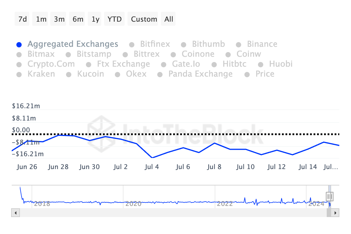 اعتبارا من 16 يوليو ، تم سحب رموز LINK بقيمة 8 ملايين دولار من البورصات ، وفقا لبيانات IntoTheBlock.