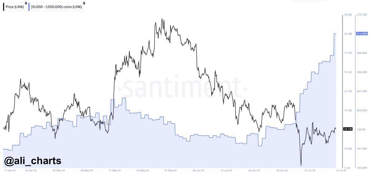 أيضًا، أشار محلل العملات الرقمية علي مارتينيز، في منشور على منصة X، أن حيتان عملة LINK التي تمتلك ما بين 100000 و 1000000 رمزًا قد "اشترت بشكل جماعي أكثر من 10 ملايين دولار من عملة LINK في الأسبوعين الماضيين، بإجمالي ما يقرب من 120 مليون دولار. "