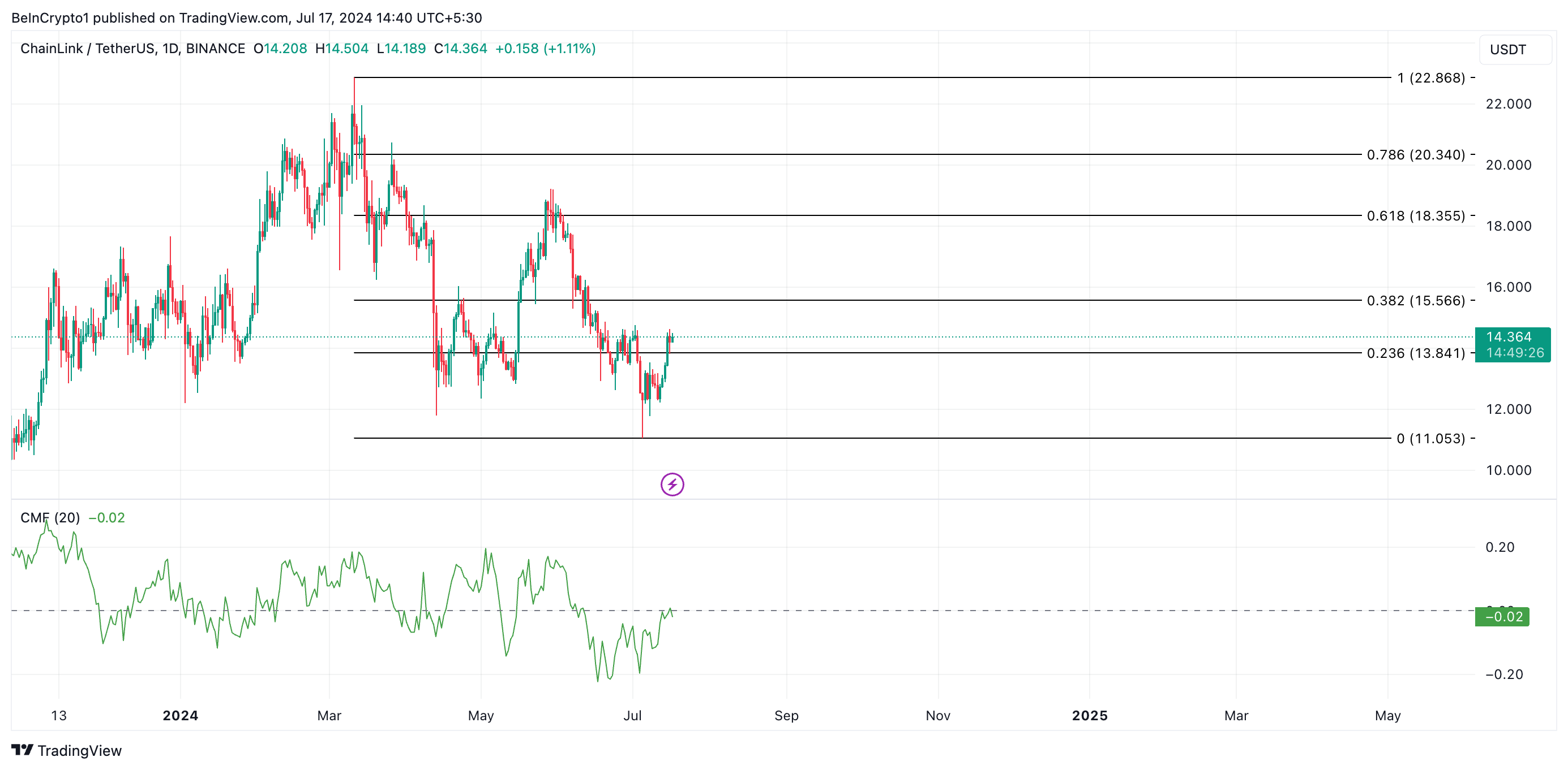 إذا حدث هذا ، ستنخفض قيمة عملة LINK إلى ما دون 14 دولارا للتداول عند 13.84 دولارا.