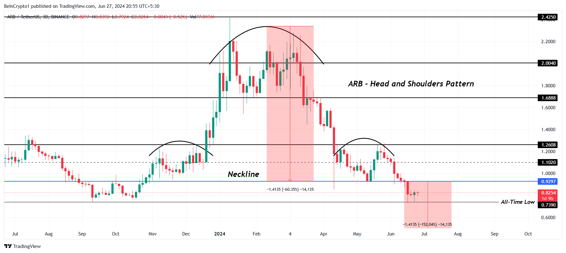 يلاحظ سعر أربيتروم (ARB) تشكيل نمط الرأس والكتفين. نمط الرأس والكتفين هو تكوين رسم بياني هبوطي يشير إلى انعكاس اتجاه محتمل. يتكون من ثلاث قمم: قمة وسطى أعلى (الرأس) بين قمتين أدنى (الكتفين).
