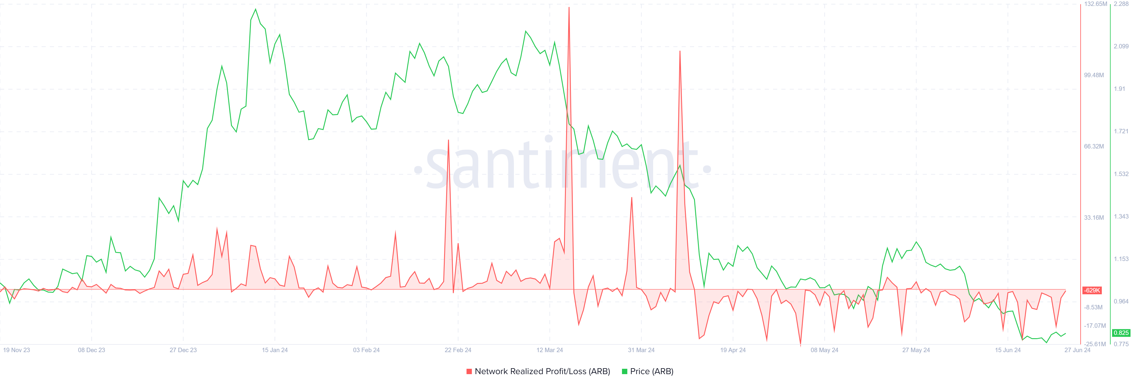 قد يكون سعر أربيتروم (ARB) على وشك تسجيل أدنى مستوى جديد على الإطلاق بينما تلاشى التفاؤل بين حاملي ARB تمامًا. لقد كان مستثمرو أربيتروم يتكبدون خسائر مستمرة في معاملاتهم منذ منتصف أبريل. يتم تسليط الضوء بوضوح على هذا الاتجاه المستمر من خلال مقياس الربح/الخسارة المحقق، الذي يبرز التحديات المالية التي يواجهها المستثمرون.