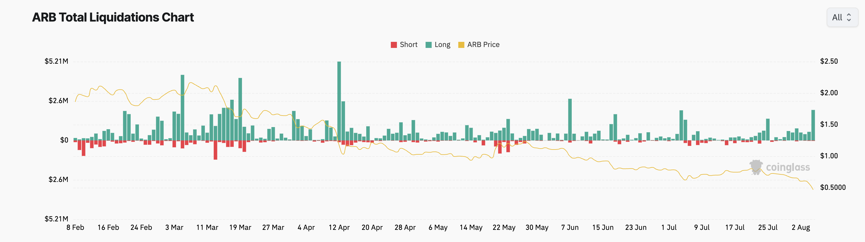 بالإضافة إلى ذلك، أدى انخفاض السعر إلى زيادة في تصفيات الطويلة، حيث اضطر المتداولون الذين كانوا على الجانب الخاطئ من السوق إلى إغلاق مراكزهم. وفقًا لبيانات Coinglass، بلغت تصفيات ARB الطويلة 2,01 مليون دولار في وقت كتابة هذا التقرير. وكانت آخر مرة وصلت فيها التصفيات اليومية الطويلة إلى هذا الارتفاع في 7 يونيو.
