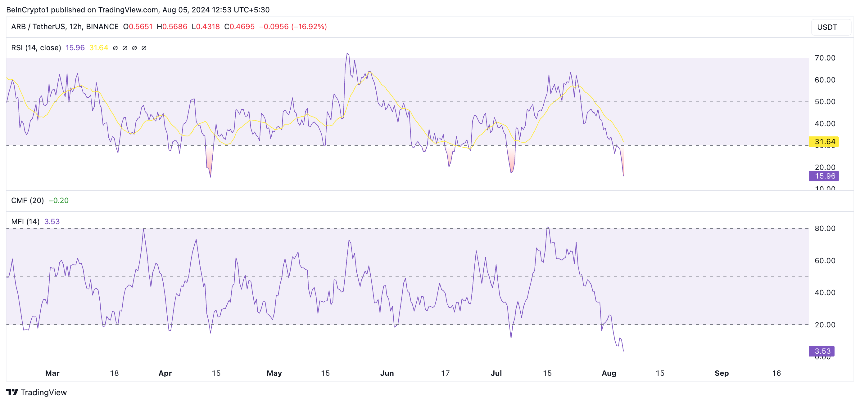 في وقت النشر، RSI لـ ARB هو 15,96، بينما MFI هو 3,53. تشير هذه القيم إلى أن ARB مبالغ في بيعها وقد تشهد قريبًا تصحيحًا إيجابيًا.