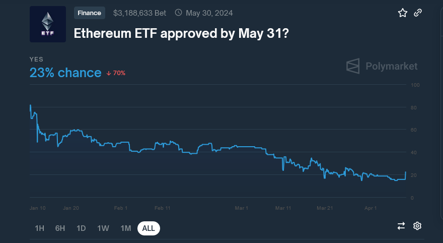 ويرى المراهنون على Polymarket فرصة 23% للموافقة على صناديق ETF إثيريوم الفوري في الولايات المتحدة بحلول نهاية مايو و 45% فقط للموافقة بحلول نهاية يونيو.