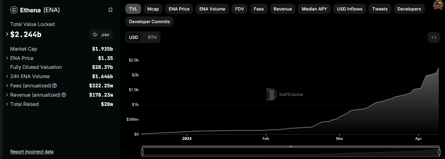 و تشير بيانات منصة defillama أن القيمة المقفلة الإجماليةTVL من عملة ENA الخاصة بروتوكول التمويل اللامركزي DeFi إيثينا Ethena قد تجاوز حاجز 2.2 مليار دولار على مدى الأيام القليلة الماضية بعد أن تجاوز ملياري دولار في 6 أبريل.