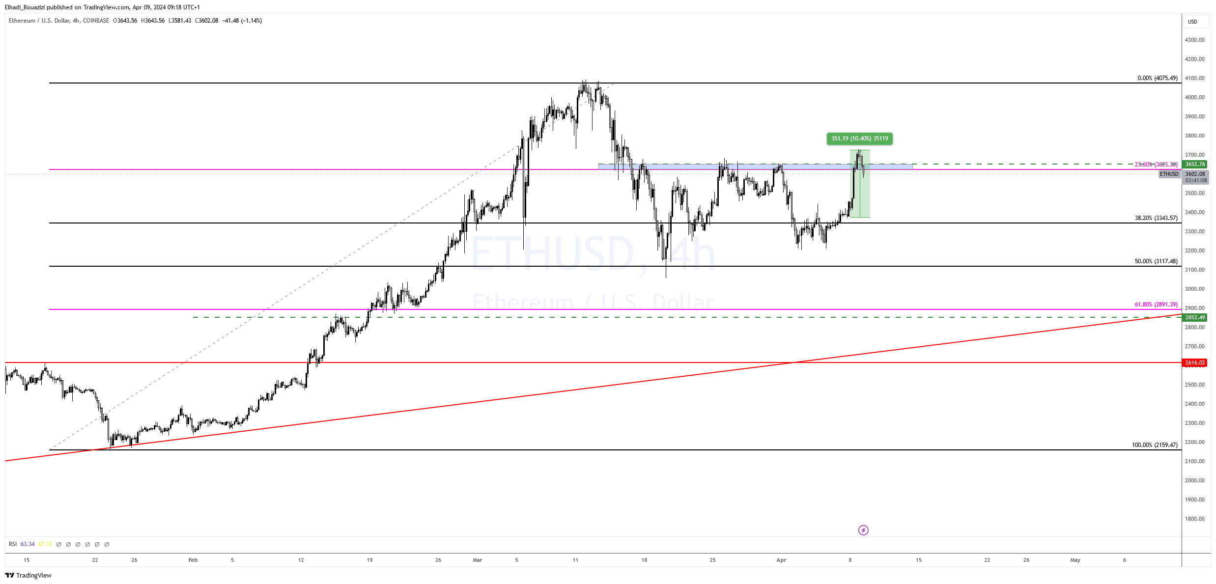 على الرسم البياني 4سا نلاحظ أن ارتفاع سعر إيثيريوم ETH بلغ فوق المقاومة مستوى 3650 دولار، أين يوجد تصحيح فيبوناتشي 23.6% و مجموعة من القمم السابقة التي تشير إلى قوة هذه المقاومة.