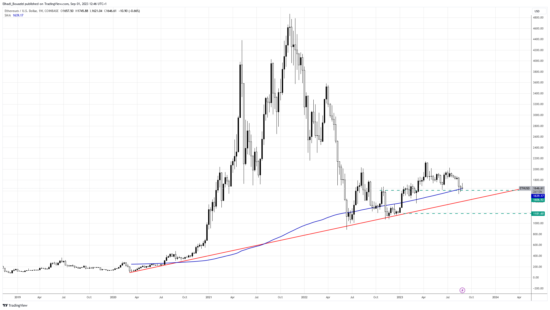 على الرسم البياني الأسبوعي، نلاحظ أن موجة انخفاض سعر إيثريوم ETH قد توقفت عند المتوسط الحسابي 200 أسبوع عند 1640 دولار.