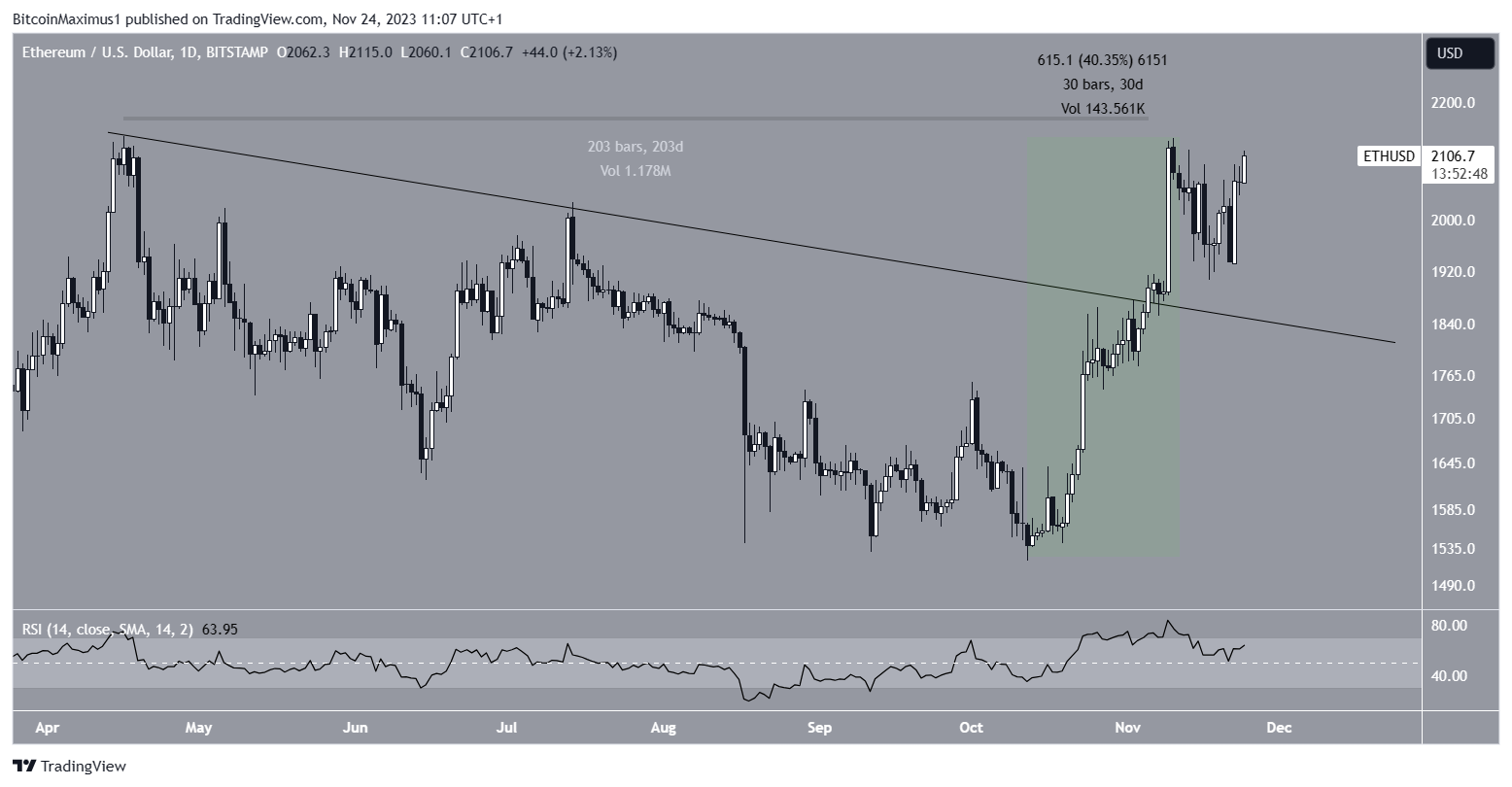 يظهر التحليل الفني للإطار الزمني اليومي أن سعر ETH ارتفع بسرعة منذ بداية أكتوبر. خلال هذا الوقت، خرج من خط اتجاه المقاومة الهابط الذي كان قائمًا لمدة 203 يومًا، منذ أعلى مستوى سنوي في 16 أبريل.