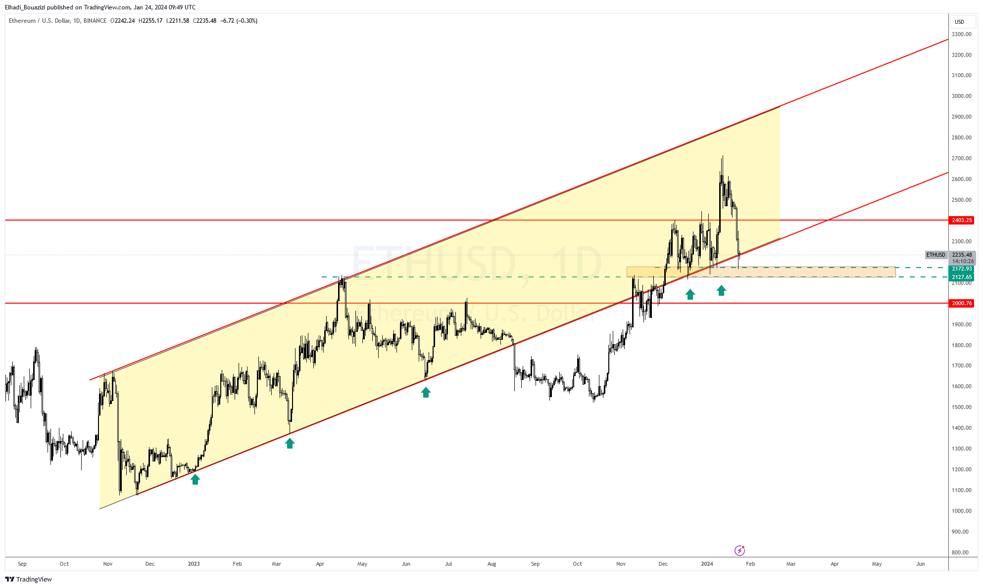 يمكننا ملاحظة أن قاع الشمعة اليومية لسعر عملة إيثريوم ETH يوم أمس لامس مستوى 2170 دولار . قبل أن يرتد و تُغلق الشمعة فوق خط الاتجاه الصاعد.