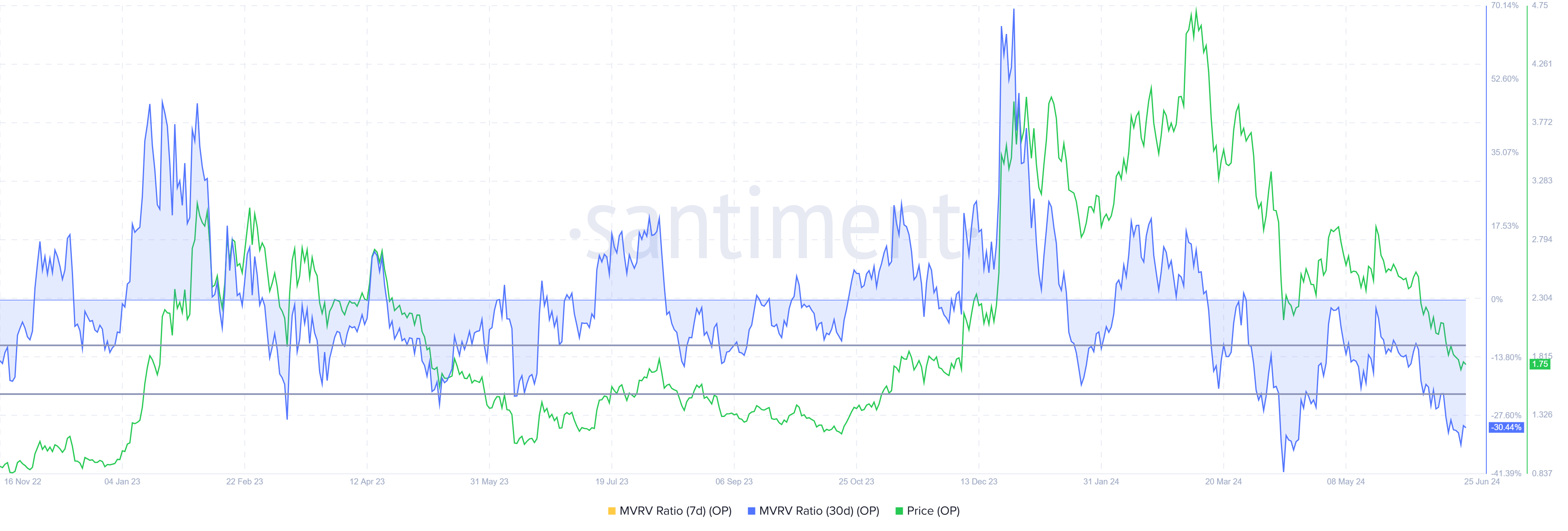 تقيس نسبة MVRV ربح/خسارة المستثمر. MVRV لـ30 يومًا في الأوبتيميزم عند 10% تشير إلى خسائر، مما قد يحفز الشراء. تاريخيًا، تقع نسبة MVRV للأوبتميزم بين -10% و-20% غالبًا ما تسبق التعافي والتجمعات، مما يعتبرها منطقة فرصة للتجميع.