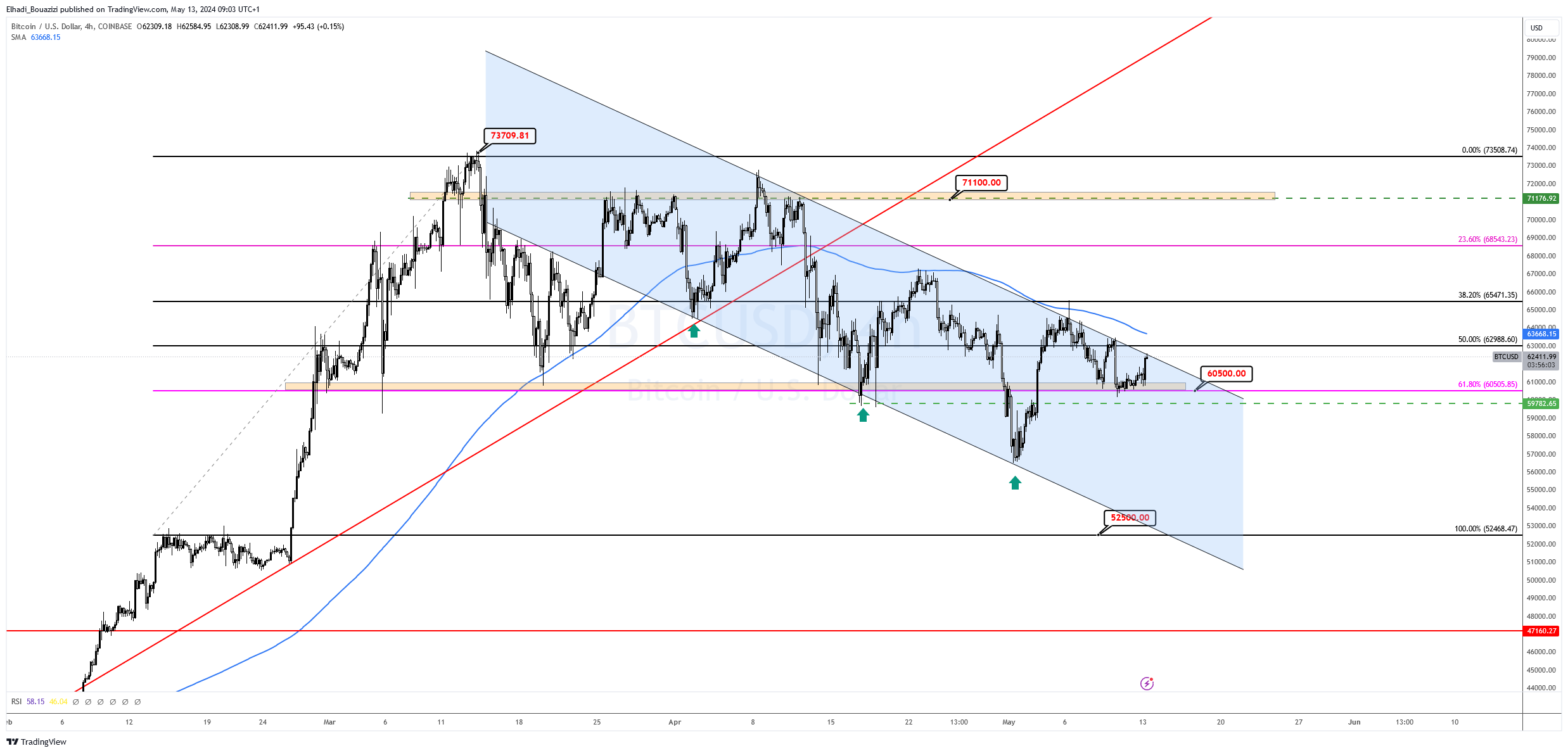 بعد أن عاد سعر BTC فوق مستوى الدعم 60,500 دولار يجب أن نراقب كيف سوف يتعامل معه في الأيام المقبلة. كسره سوف يكون إشارة لهبوط السعر نحو الحد السفلي للقناة السعرية.