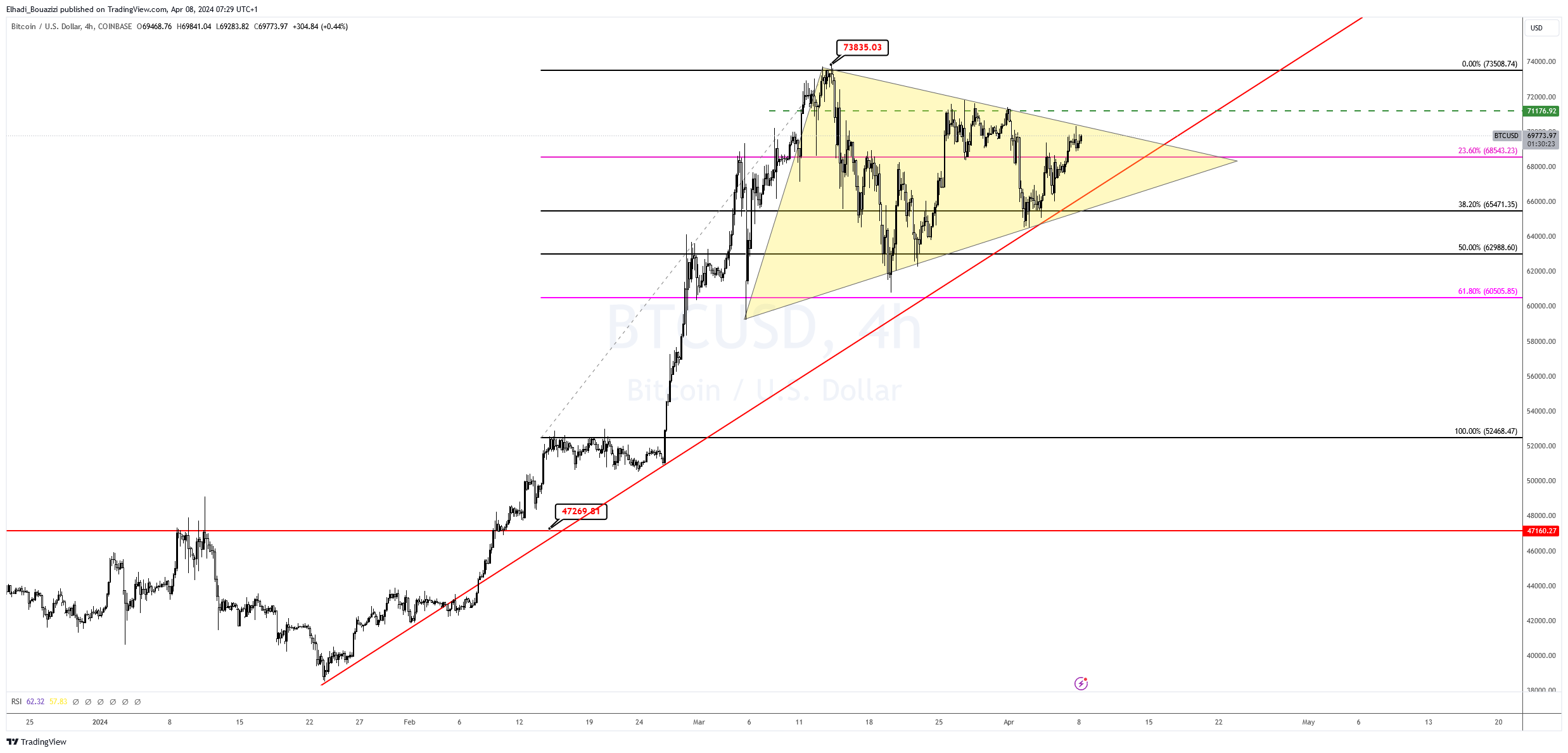 عاد سعر BTC الآن للتداول تحت مستوى فيبوناتشي 23.6% عند سعر 68,500 دولار. و لكنه بقي تحت الحد العلوي لنموذج للمثلث المتماثل على الرسم البياني 4سا.