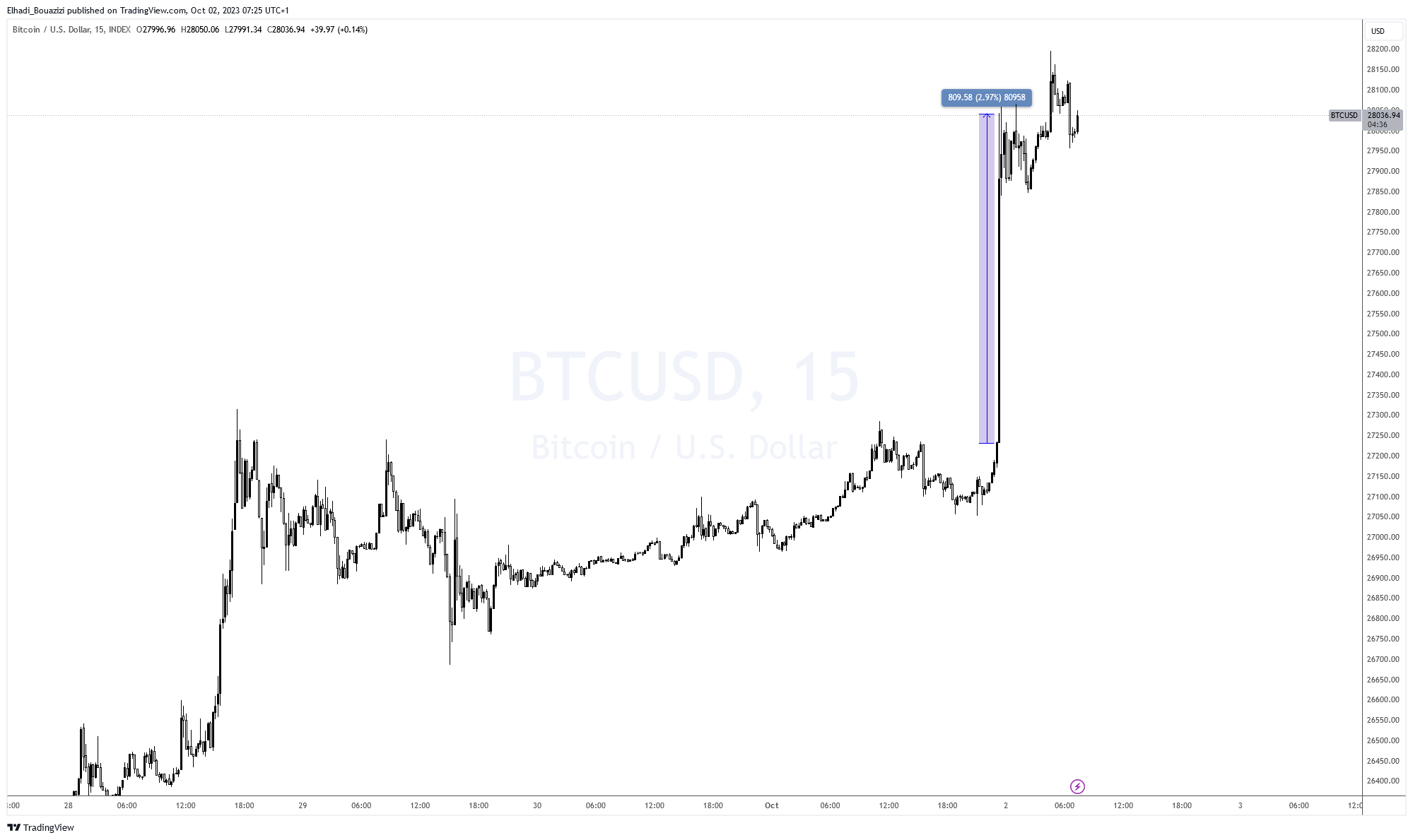 ارتفع سعر بيتكوين BTC بقوة في تداولات اليوم الأول من شهر أكتوبر. حيث ارتفع السعر من حوالي 27200 دولار إلى 28000 دولار، أي 800 دولار في غصون 15 دقيقة. هذا الصعود القوي لم يكن له سبب واضح. و هو ما الكثير من المتداولين في حيرة من أمرهم.
