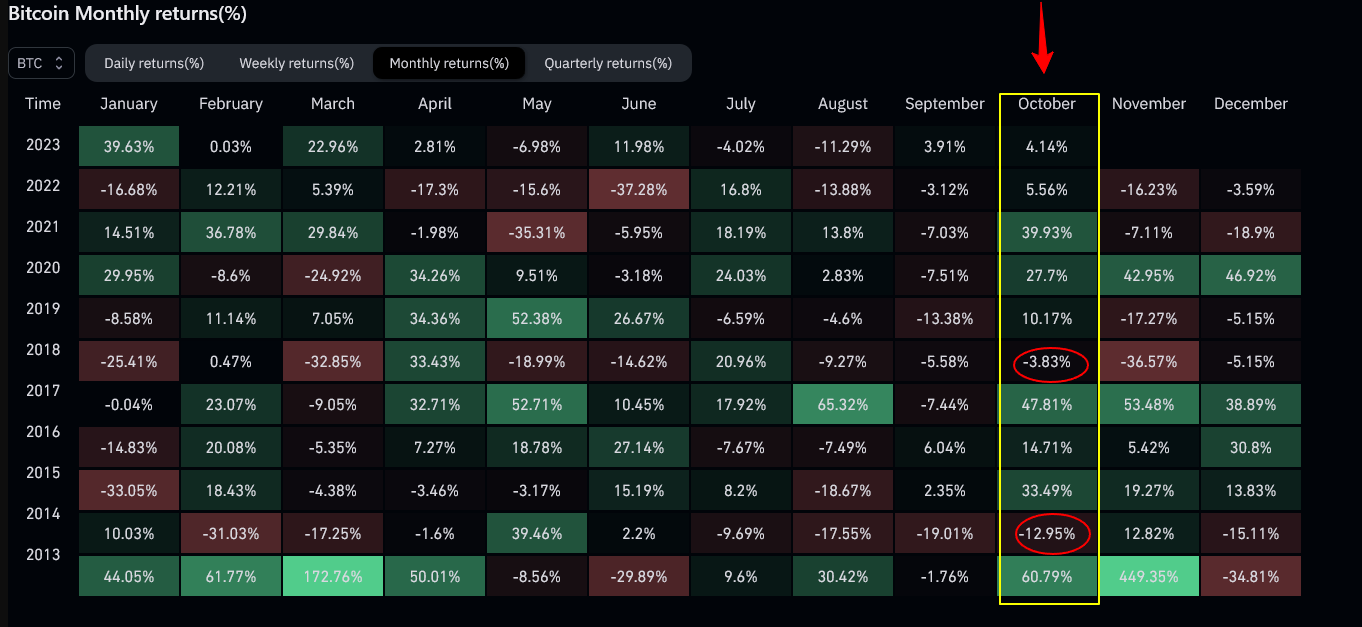 في المقابل، أشار البعض على منصة تويتر إلى ما يسمى Uptober. و هي ظاهرة ارتفاع سعر بيتكوين في شهر أكتوبر من كل عام.