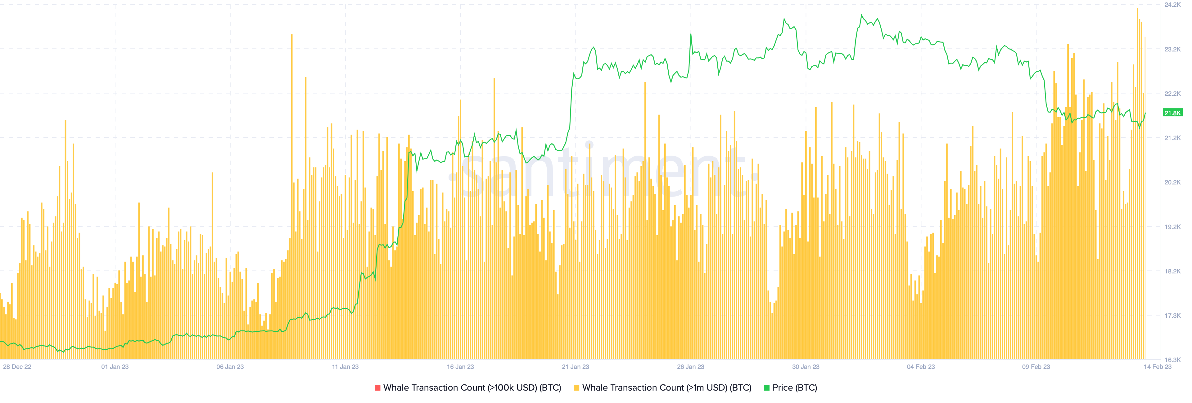 بينما كان سعر البيتكوين ينخفض خلال الأسبوعين الماضيين، يُظهر مقياس عدد معاملات الحيتان (بيع و شراء) ارتفاعًا كبير. هذه المعاملات التي تبلغ قيمتها 1،000،000 دولار أو أكثر تعدّ بمثابة وإشارة عن تحركات الحيتان أو المتداولين الأفراد و الشركات ذوي الملاءة المالية العالية.