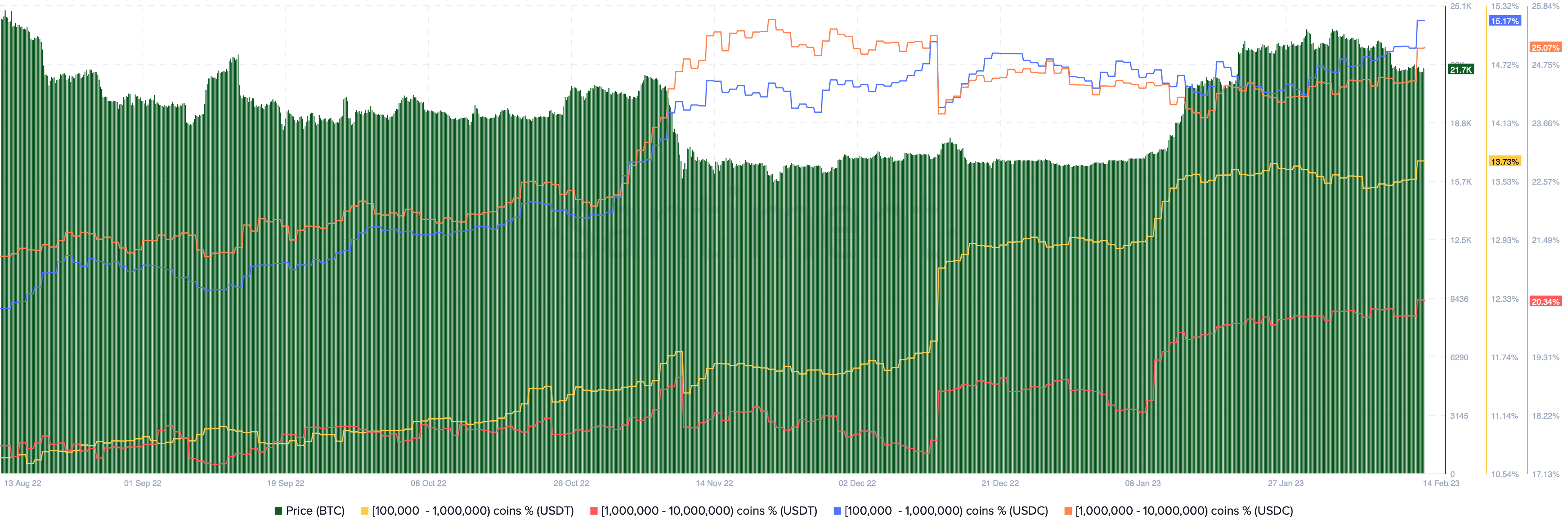 الرسم البياني التالي يٌظهر ارتفاع حاد و مفاجئ آخر 48 ساعة. في حيازات الحيتان (التي تمتلك ما بين 100 ألف دولار أمريكي حتى 10 ملايين دولار) من عملة التيثر (USDT) و أيضا العملة المستقرة يو إس دي كوين (USDC).