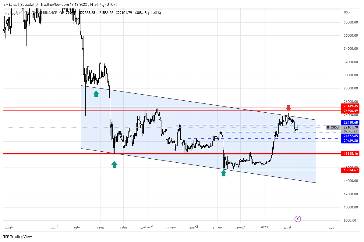سعر البيتكوين مزال يتداول لليوم الخامس على التوالي بجوار مستوى الدعم 21372. بعد موجة التصحيح الهابطة التي انخفض فيها سعر البيتكوين بنسبة 12% من أعلى مستوى له هذا العام عند مستوى 23247.