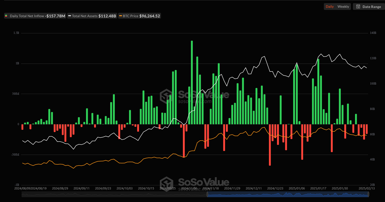 وتكشف بيانات SosoValue أن صناديق ETF بيتكوين الفورية المسجلة في الولايات المتحدة سجلت تدفقات صافية خارجة بلغت 651.83 مليون دولار خلال الأسبوع الماضي، وهو أكبر تدفق أسبوعي خارجي لهذه الصناديق منذ الأسبوع الأول من سبتمبر 2024.