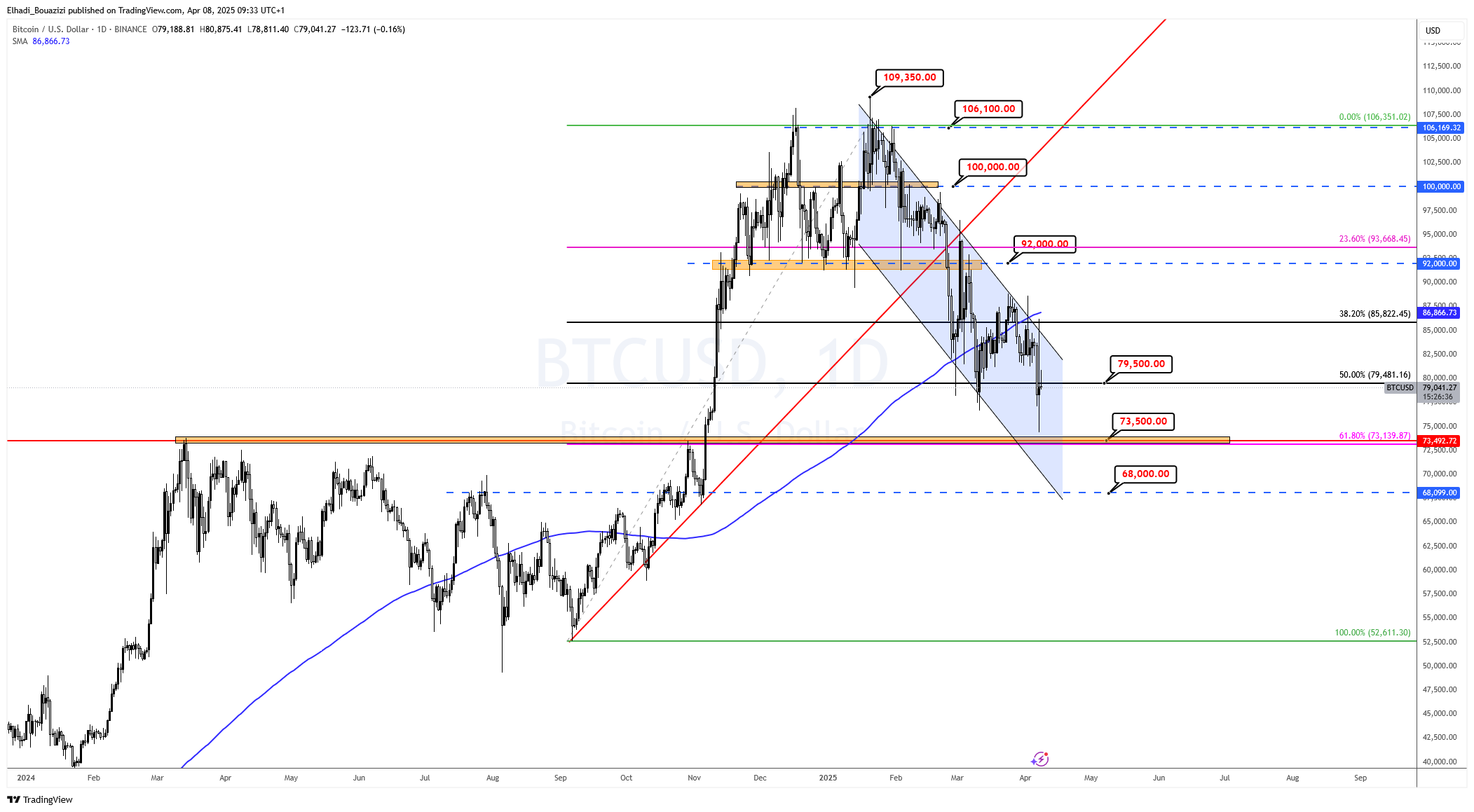 - 73,500 دولار – يتوافق مع نسبة 61.8% من تصحيح فيبوناتشي (مستوى ذهبي)، وقد يكون منطقة ارتداد محتملة.