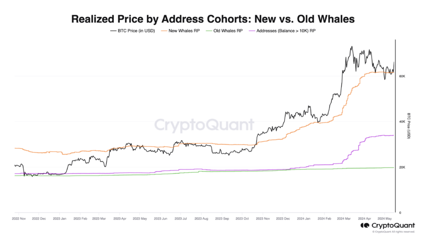 • السعر المحقق للحيتان الجديدة: الحيتان الجديدة - العناوين التي تحتوي على أكثر من 1000 BTC مع وقت احتجاز عملة أقل من 6 أشهر - كانت تتراكم بشكل كبير حول علامة 60000 دولار. يعد نشاط الشراء هذا أمرا بالغ الأهمية ، حيث يعزز 60,000 ألف دولار كمستوى دعم رئيسي. يظهر التراكم المستمر عند هذا السعر ثقة قوية بين الحيتان الجديدة ، مما يعزز مستوى الدعم لسعر البيتكوين. يشير متوسط سعر الاستحواذ ، أو السعر المحقق ، لهذه الحيتان الجديدة ، إلى أن كل بيتكوين اشتروه تم الحصول عليه ، في المتوسط ، بسعر 60000 دولار.