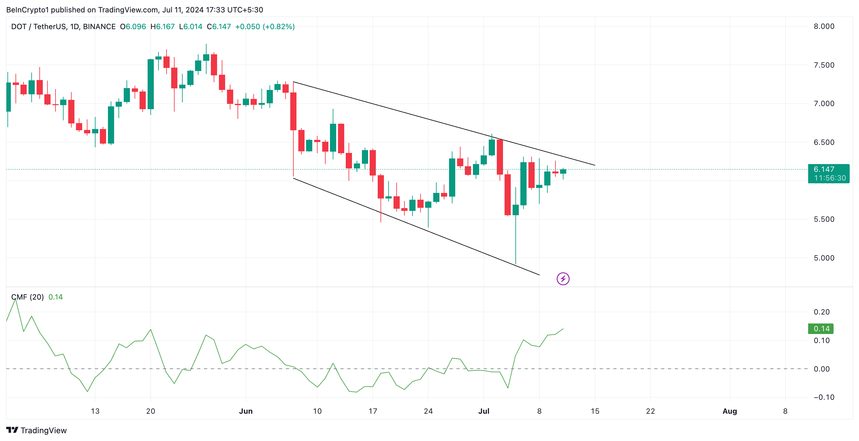 في وقت النشر، يتم تداول العملة البديلة بسعر 6,12 دولار، منخفضة بنسبة 7% منذ 7 يونيو. ارتفع سعر DOT بنسبة 5% في الأسبوع الماضي ومن المتوقع أن يتجاوز الخط العلوي لهذه القناة—تشير قراءات تدفق الأموال تشايكين (CMF) إلى هذه الإمكانية.
