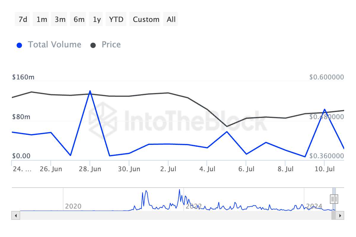 وفقًا لبيانات من IntoTheBlock، في 11 يوليو، بلغ إجمالي حجم المعاملات الكبيرة لعملة بوليجون MATIC حوالي 103 ملايين دولار. وهذا يمثل زيادة بنسبة 1,493.81% مقارنة بـ 6.45 ملايين دولار التي سُجلت في حجم المعاملات في اليوم السابق.