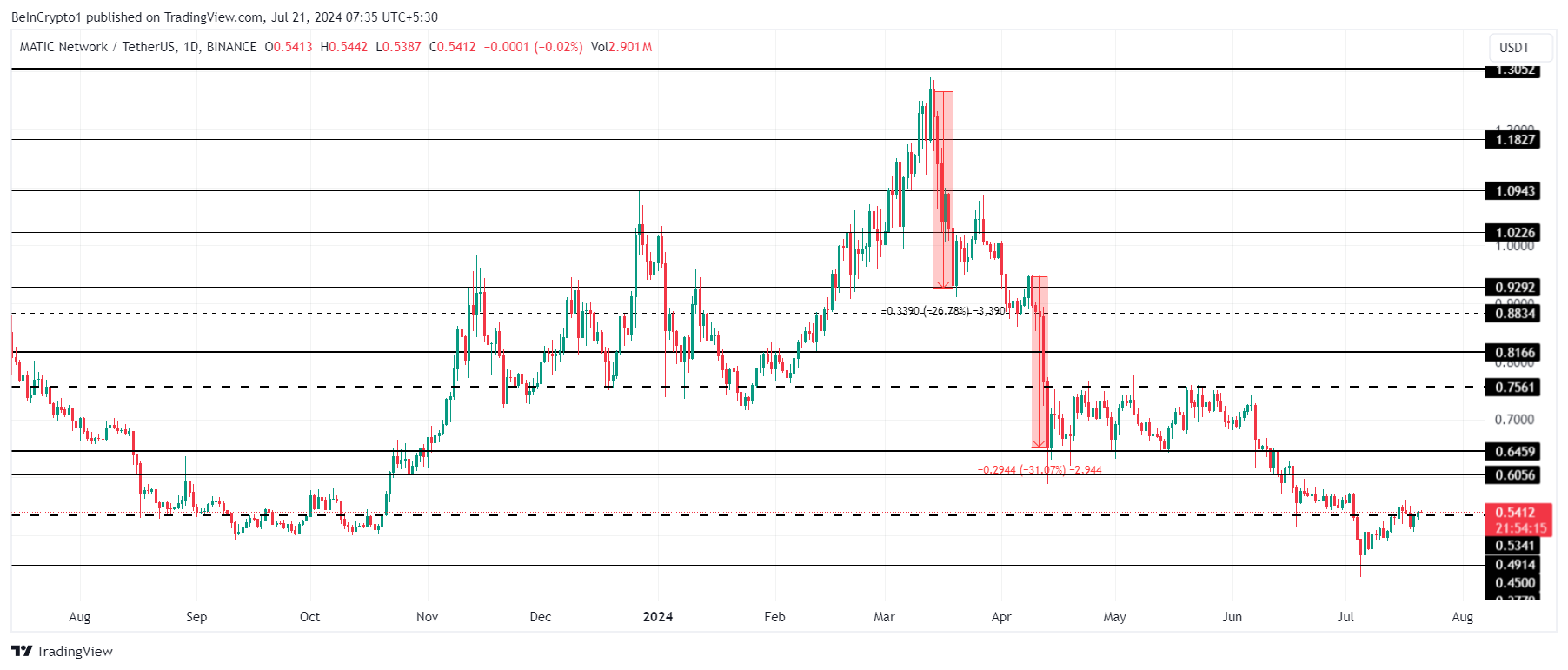 لم يبدُ أن سعر بوليجون (MATIC) قد التزم بالتعافي القوي مع باقي العملات المشفرة بعد أن انخفض دون 0,50$.