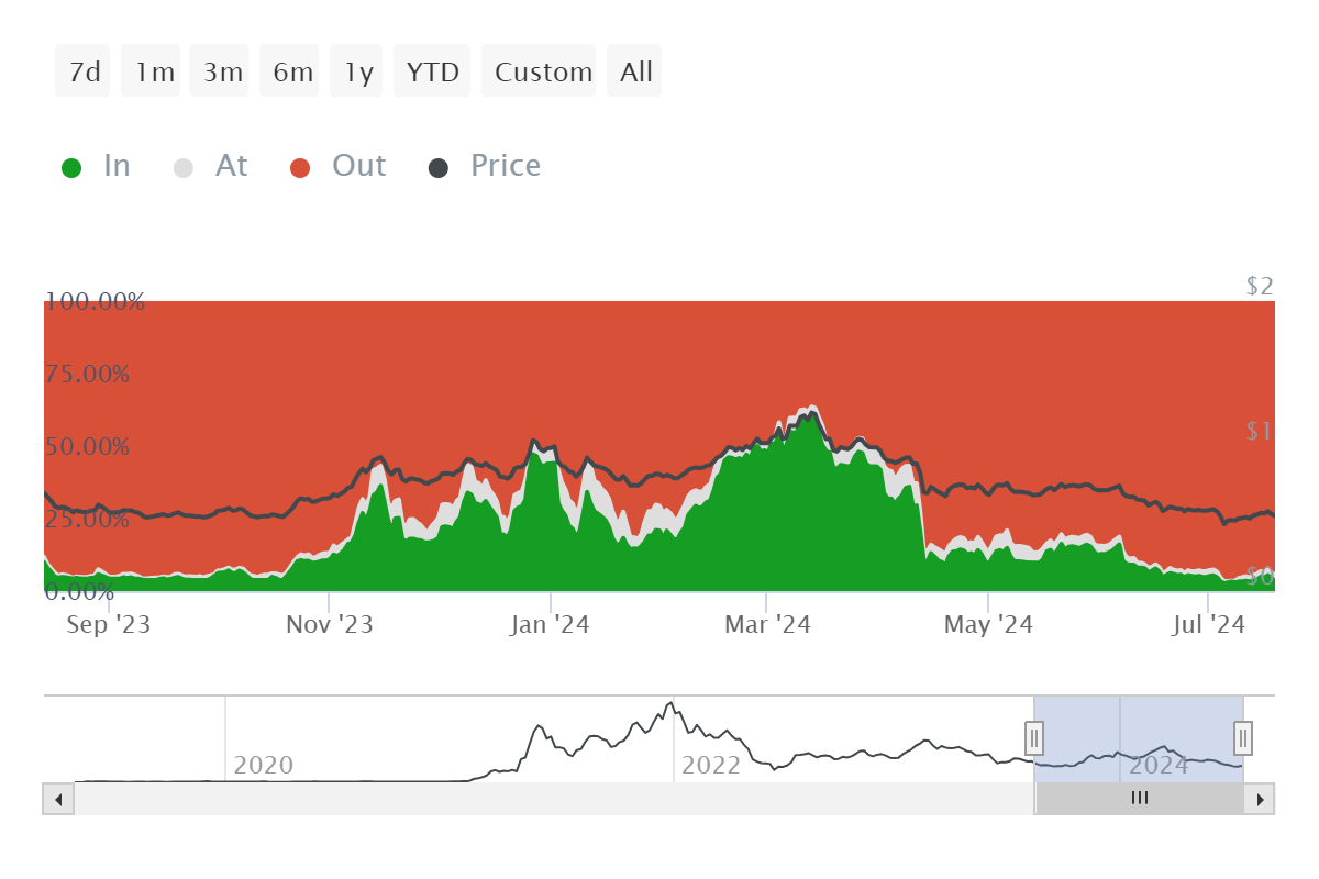 وفقًا لمؤشر الدخول/الخروج التاريخي للأموال، أقل من 3% من المستثمرين يحققون أرباحًا في الوقت الحالي حيث اشتروا أصولهم دون السعر الحالي. هذا يدفعهم للتصرف بما يتماشى مع تحقيق الأرباح.