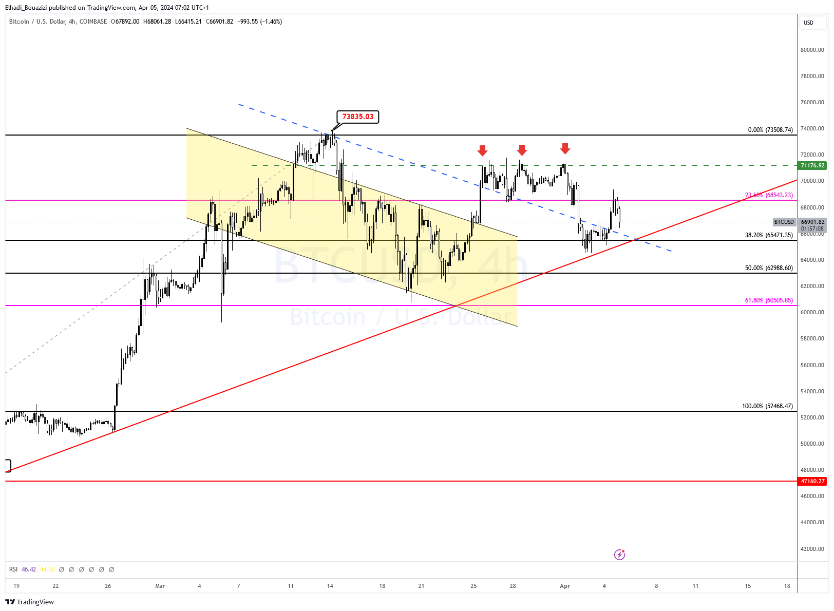 رغم ارتفاع سعر البيتكوين BTC إلا أنه لم يخرج من نطاق المستويات الفنية التي أوضحناها في تحليلاتنا السابقة. حيث ارتد السعر من منطقة دعم قوية تتشكل من خط الاتجاه الصاعد و مستوى فيبوناتشي 38.2% عند سعر 65,500 دولار.
