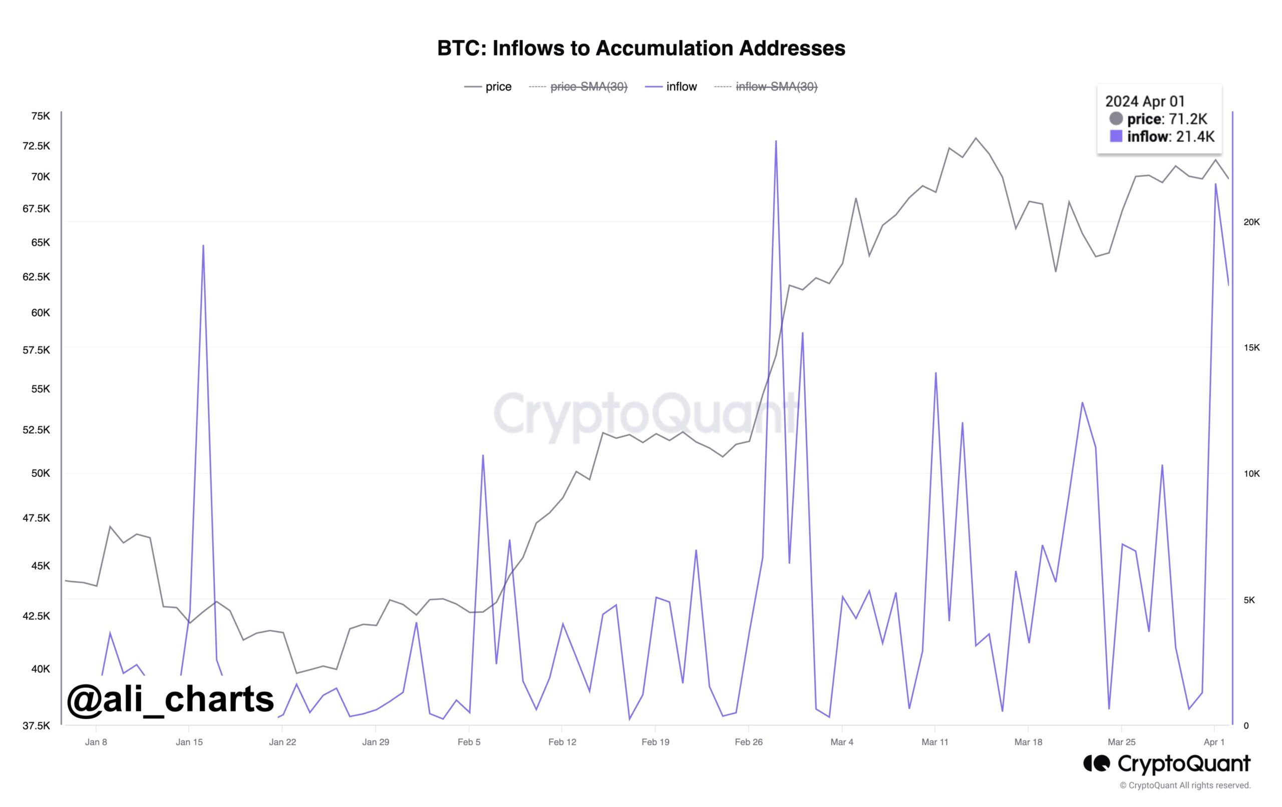 في هذا السياق، تشير بيانات منصة CryptoQuant المتخصصة في تحليل سلاسل الكتل (البلوكتشين) التي نشرها محلل العملات الرقمية @ali_charts. أن ما يعرف بـ "عناوين التجميع" تستمر في شراء كميات كبيرة من العملة الرائدة خلال الشهر الجاري. مع ارتفاع معدلات التدفقات الواردة إلى تلك العناوين.